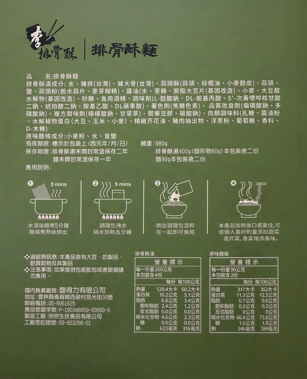 規格: 980g/盒 (排骨酥湯400公克,固形物:75公克,共二入。乾燥麵體每份90公克,共二入。)