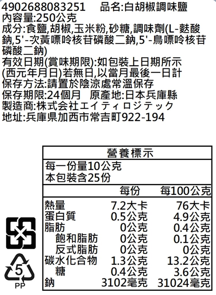 內容物名稱 食鹽.胡椒.玉米粉.砂糖.調味劑(L-麩酸 鈉.5'-次黃嘌呤核苷磷酸二鈉.5'-鳥嘌呤核苷 磷酸二鈉)