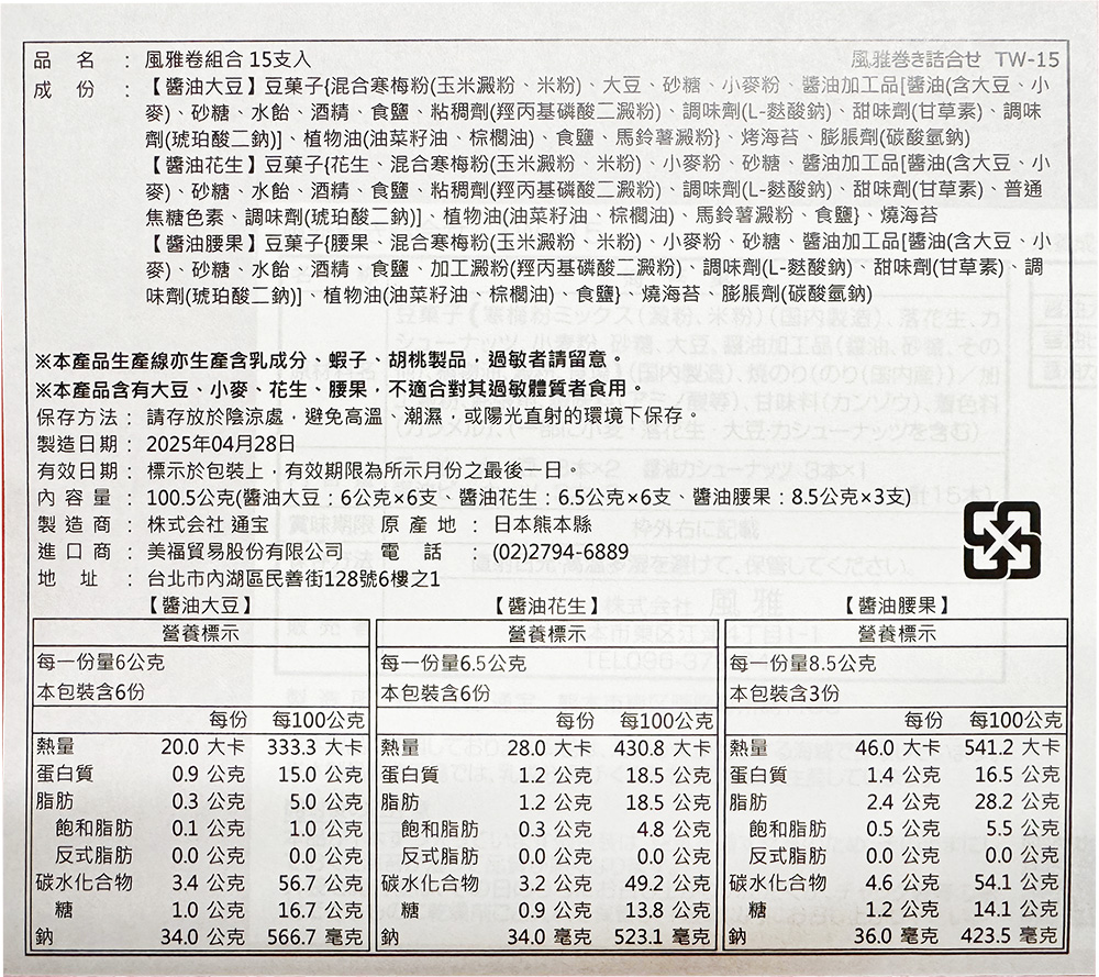從有明海新鮮採摘的紫菜 嚴選品質優良、粒粒均勻的日本生產堅果豆類 裹上麵糊 加上秘製醬汁調味 烤得香脆可口 最後由職人細心將一顆顆堅果豆子捲入海苔 棒狀設計捲入好運~ 食用好便利!