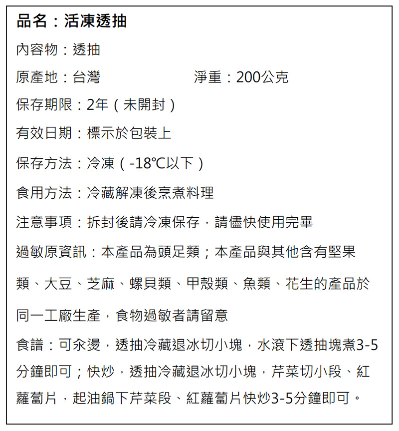 2. 本工廠為HACCP認證工廠,產線經高規格的品質管控。經過清洗、分級挑選、包裝後,經CAS細胞活存冷凍技術保存透抽的鮮甜滋味。